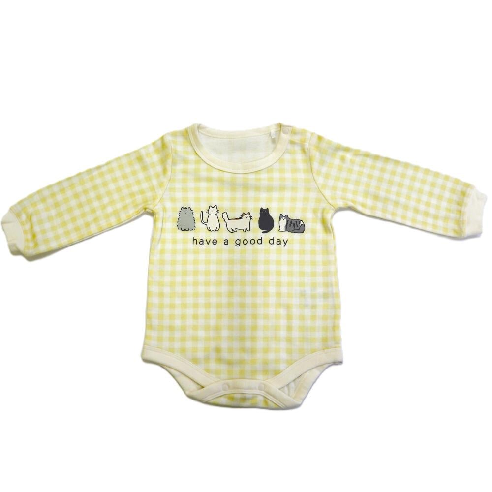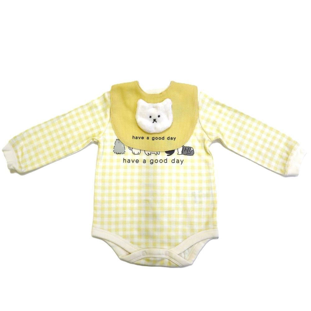 【ベビー×ペットコレクション】長袖ボディスーツ スタイ付き 格子柄 スムス ネコ イエロー×80cm