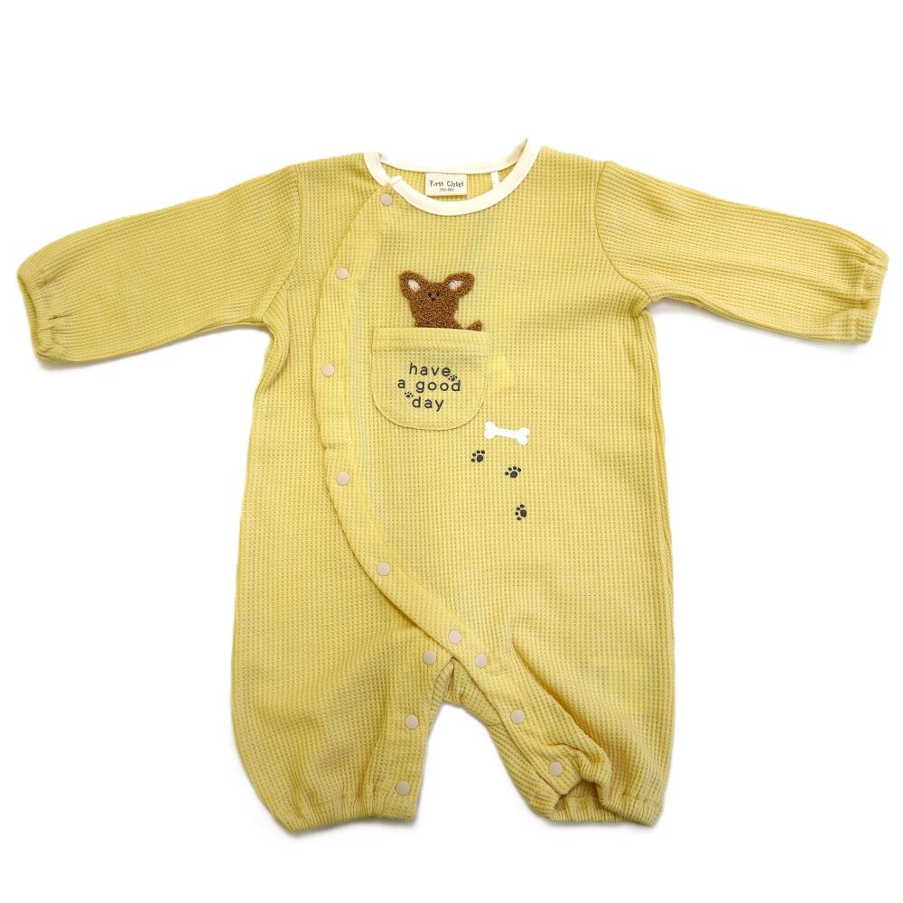 【ベビー×ペットコレクション】長袖前開きフィットオール ポケット付き 犬 イエロー×60-70cm