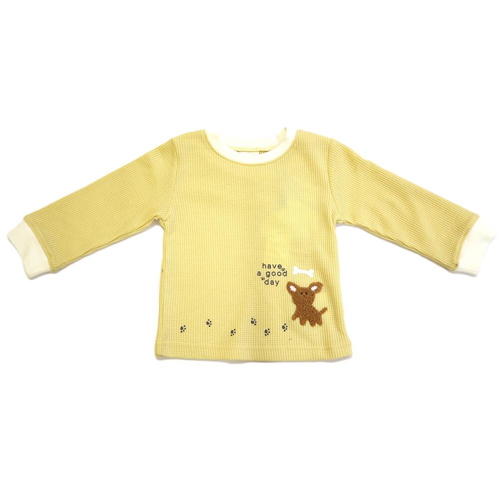 【ベビー×ペットコレクション】長袖Tシャツ ワッフル 犬ワンポイント イエロー×80cm