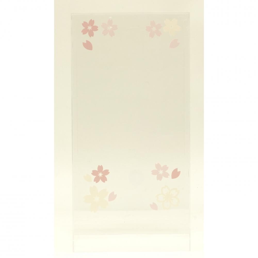 桜柄の透明なアクリルケースに、白と赤のリボンやつまみ細工を施した可愛らしい羽子板をセットしました。