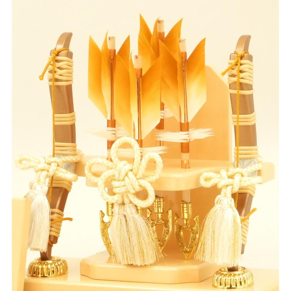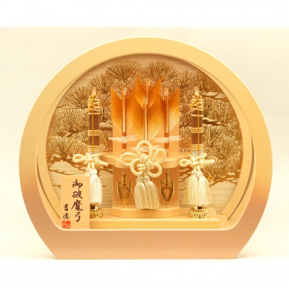 背景に金彩で松の柄を施した象牙色の暈(ぼか)しが入った丸形のアクリルケースに、天然羽根を使用した4本の矢と2本の弓を配しました。