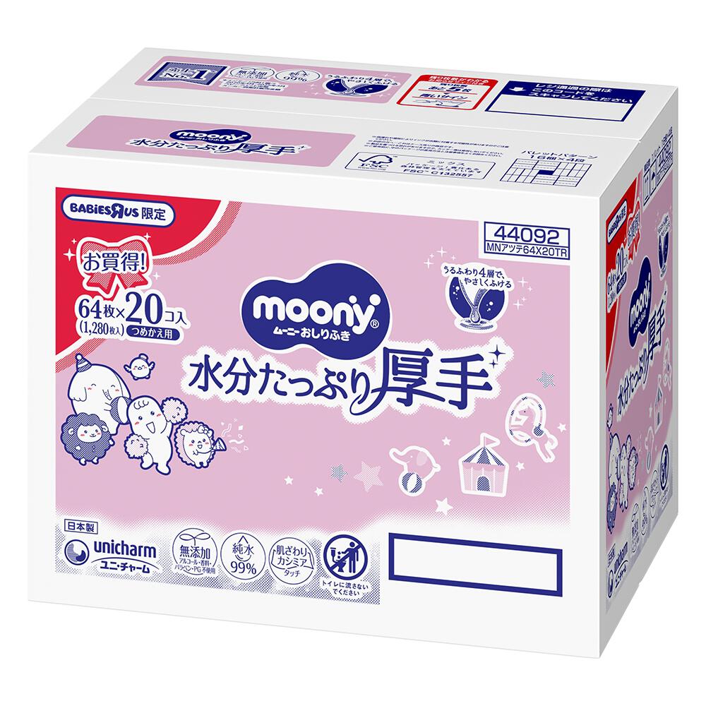 【おしりふき】ムーニー おしりふき 水分たっぷり厚手 純水99% 詰替 1280枚(64枚×20コ)無添加(アルコール・香料・パラベン不使用)日本製