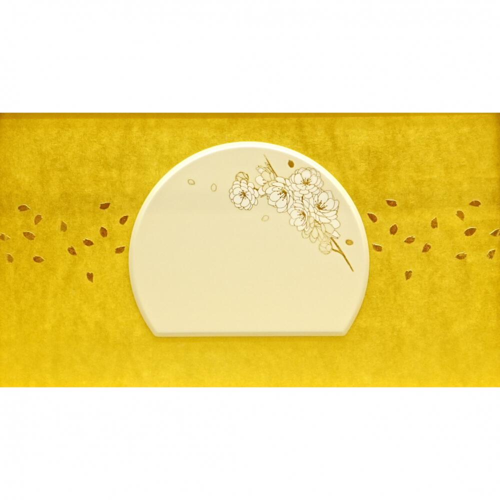 金色の背景に八重桜の蒔絵を施したプレートを配したクリーム色のアクリルケースにお人形をセットしたお飾りです。