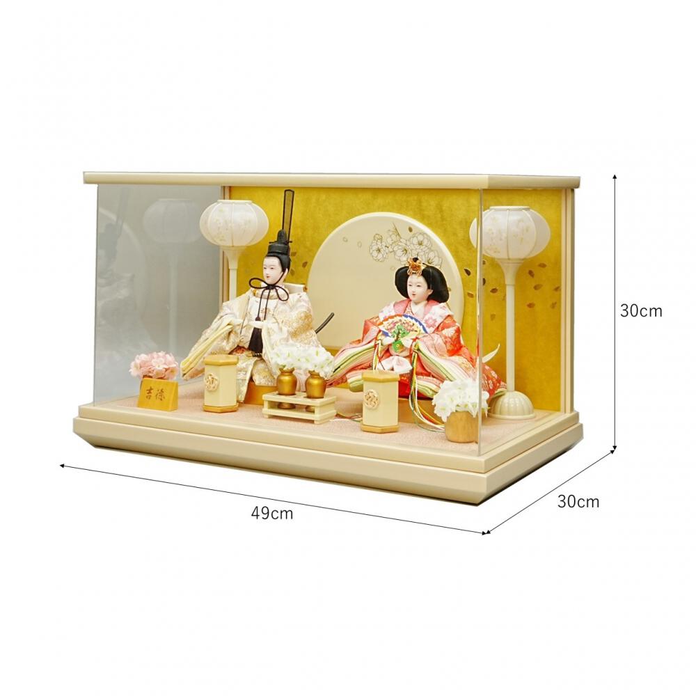 <セット内容>人形(2人)一式、アクリルケース1点、雪洞1対、花一対、道具(2点)一式、親王台1対、木札1点