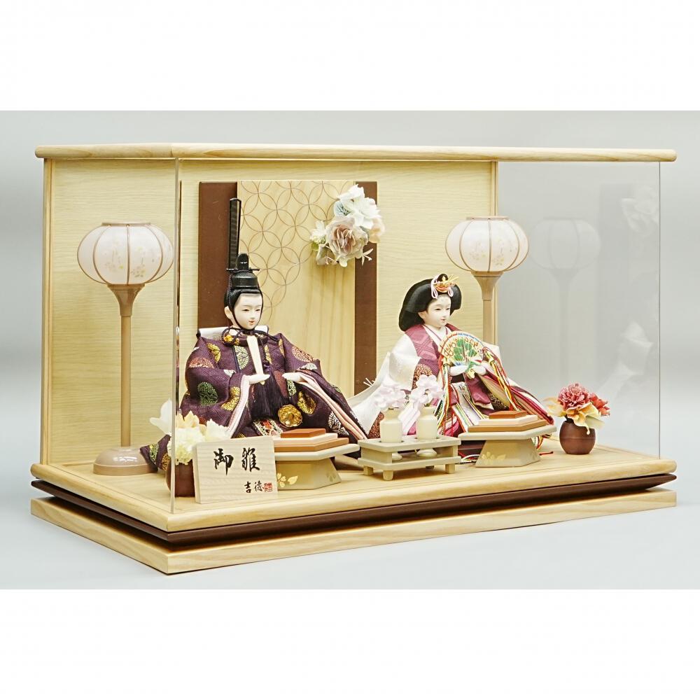 <セット内容>人形(2人)一式、アクリルケース1点、雪洞1対、花一対、道具(2点)一式、親王台1対、木札1点