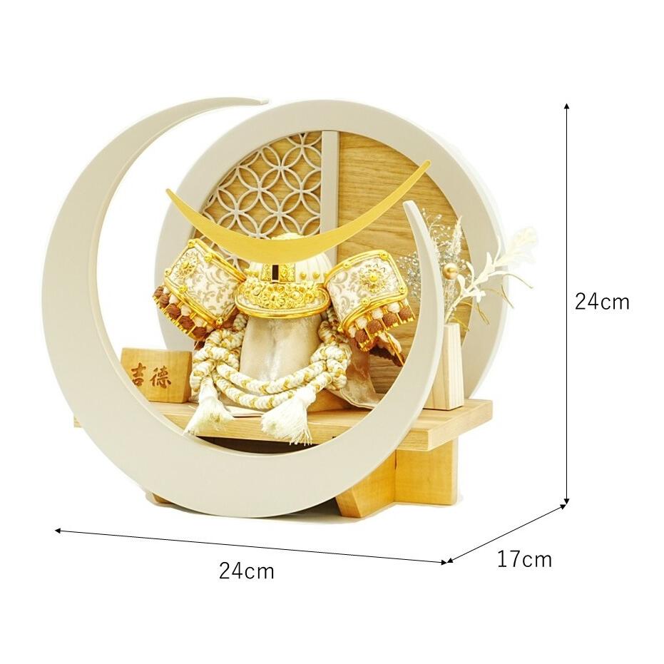 背景の丸形の衝立に七宝模様を施した飾り台に武将の甲冑の中で人気を誇る天下の独眼龍「伊達政宗公」モデルの淡い色合いの兜をセットしました。マグネットで取り外しが出来る三日月形の前面はお好みで角度を変えることが出来ます。