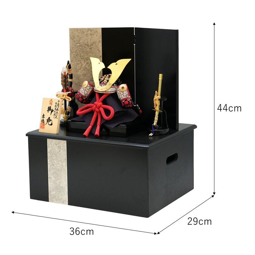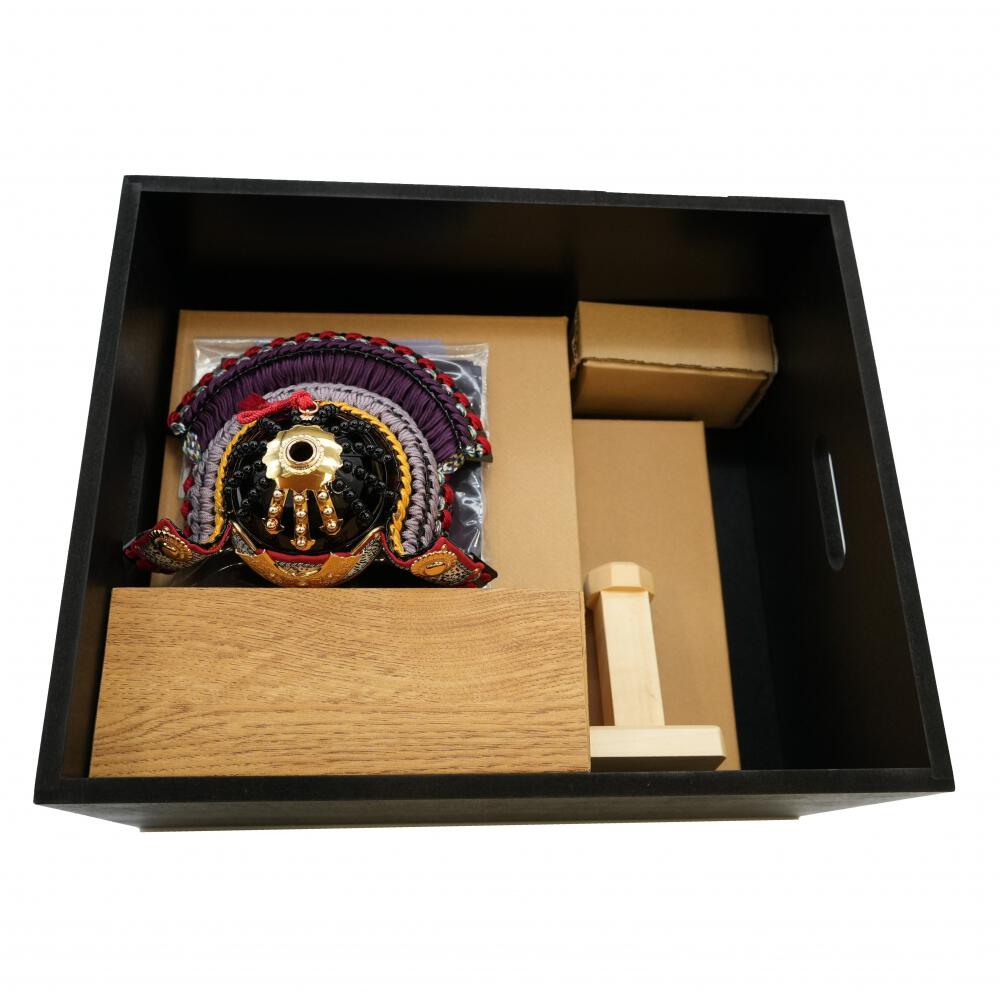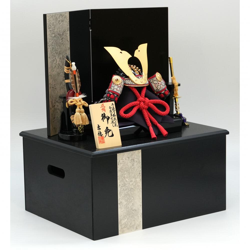 黒い石目に銀色のラインの入ったシックなデザインの収納箱に和紙小札(和紙を何枚も重ねて厚みを出した小札)と印伝を使用した吹き返しの兜をセットしました。飾り台になる収納箱に、兜と道具が全てコンパクトに収納できます。