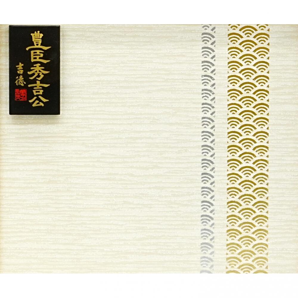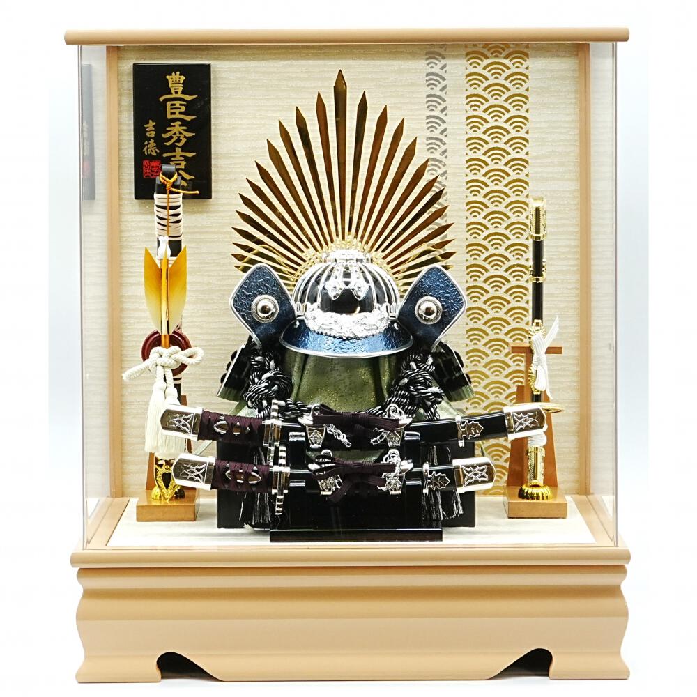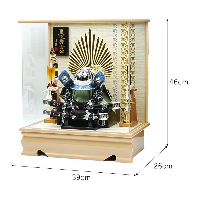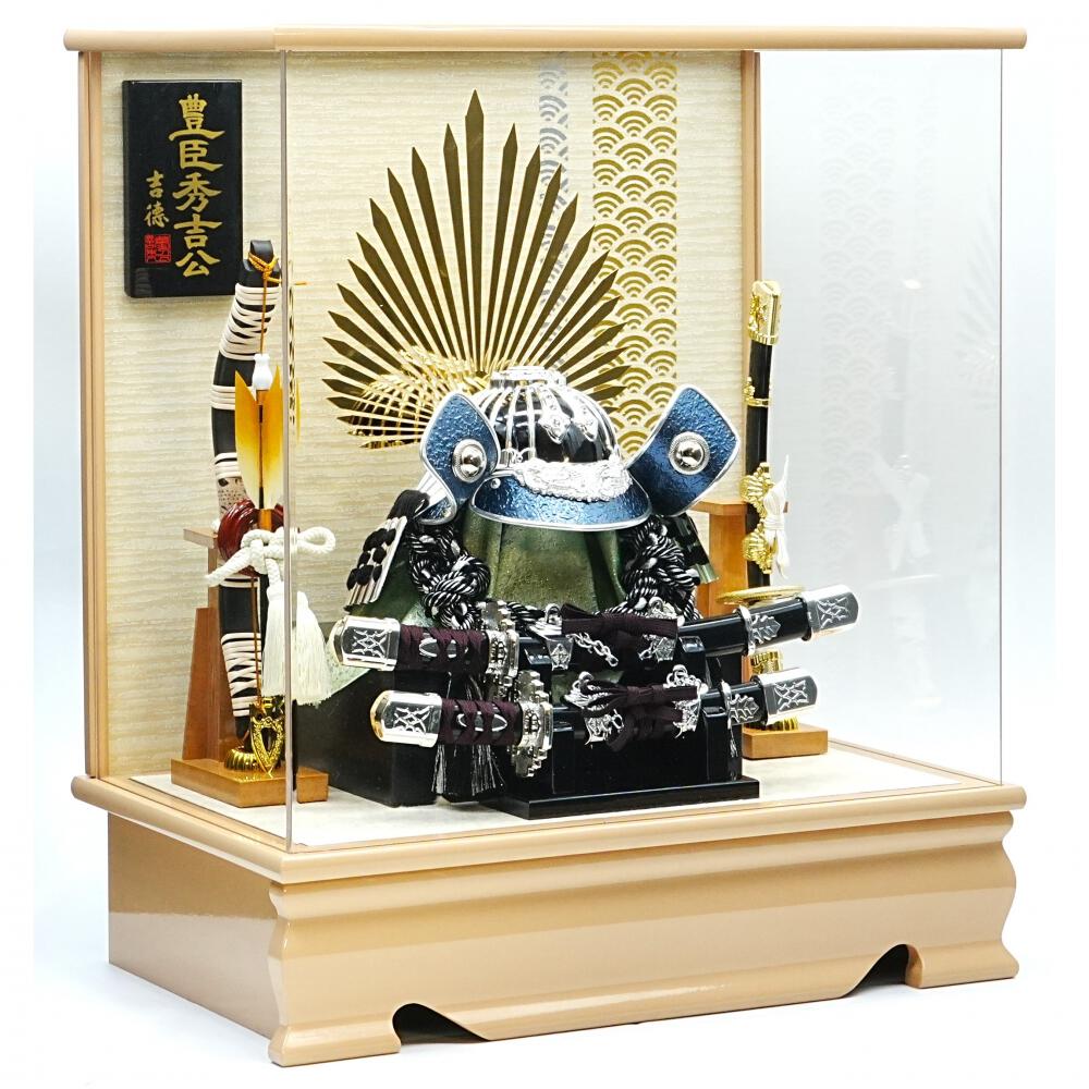 背面に青海波を施した前面に柱のないベージュ塗りのパノラマアクリルケースに尾張国出身、出世の代名詞でもある「豊臣秀吉公」モデルの兜を配しました。