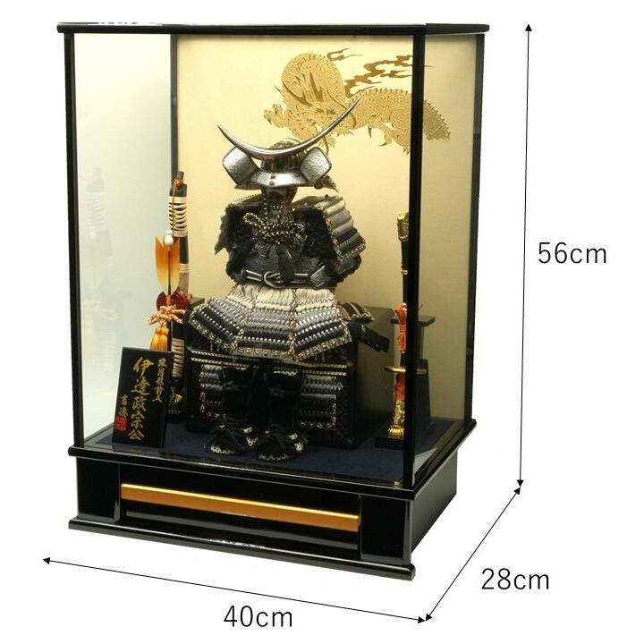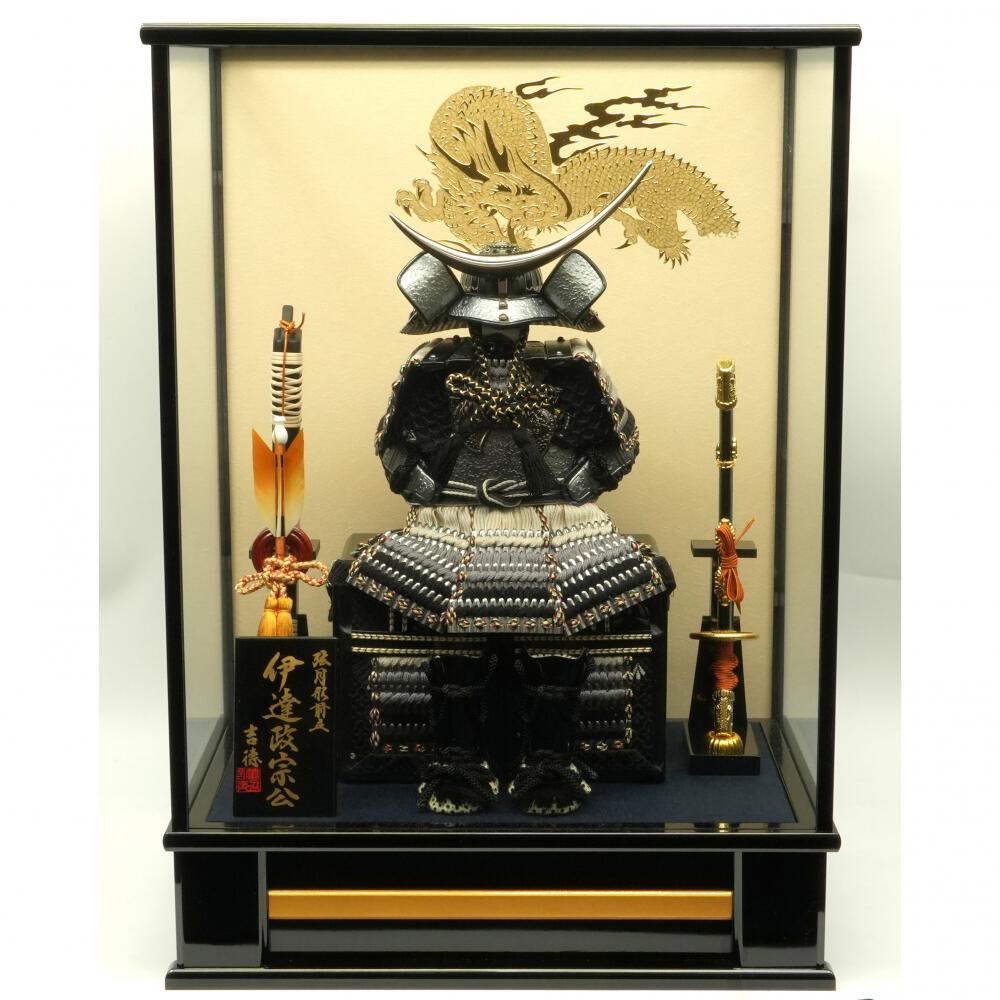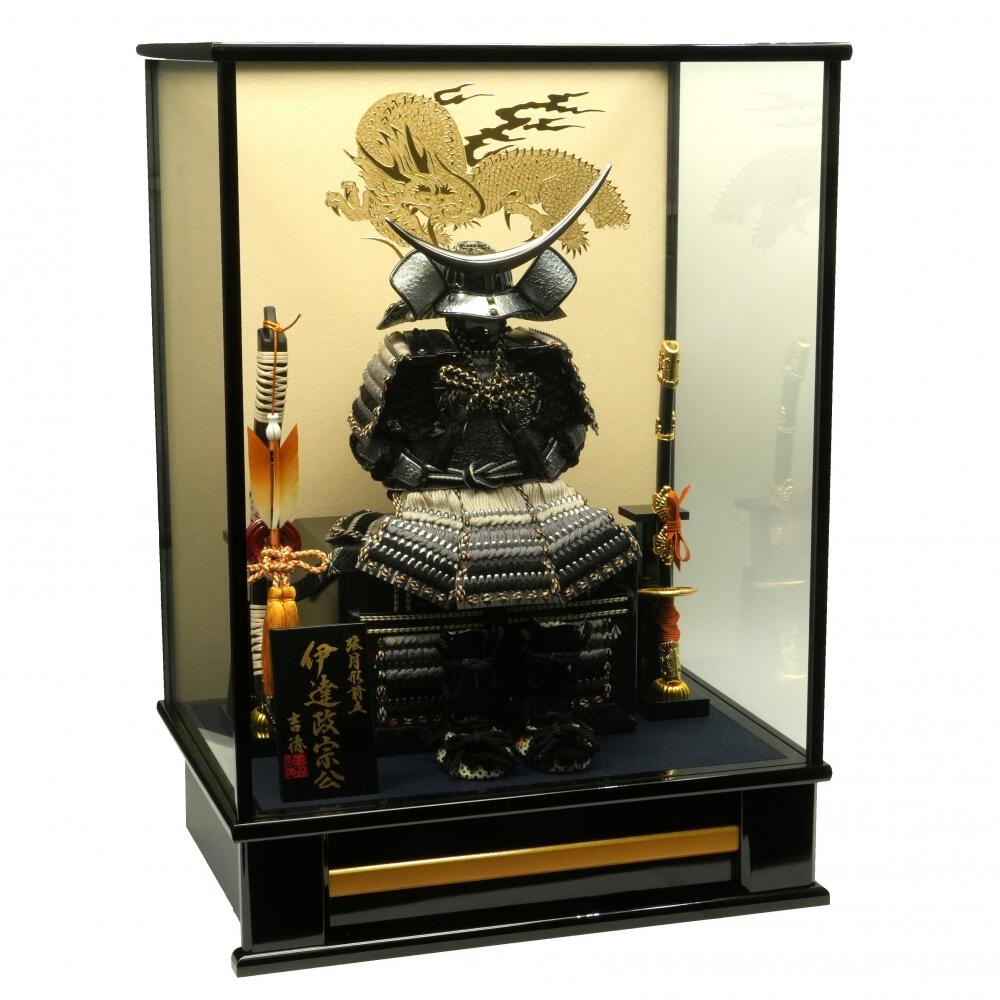 武将の甲冑の中で人気を誇る天下の独眼龍「伊達政宗公」モデルの鎧兜を背景に金彩龍を施した黒塗りのガラスケースにセットしました。