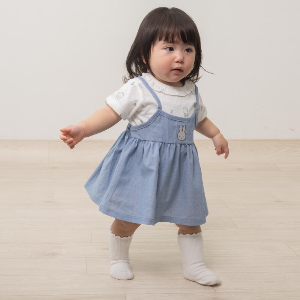 ミッフィーの総柄ロンパースに、ワンポイント刺繍がかわいいキャミソールを重ねておでかけをさらに楽しく。
