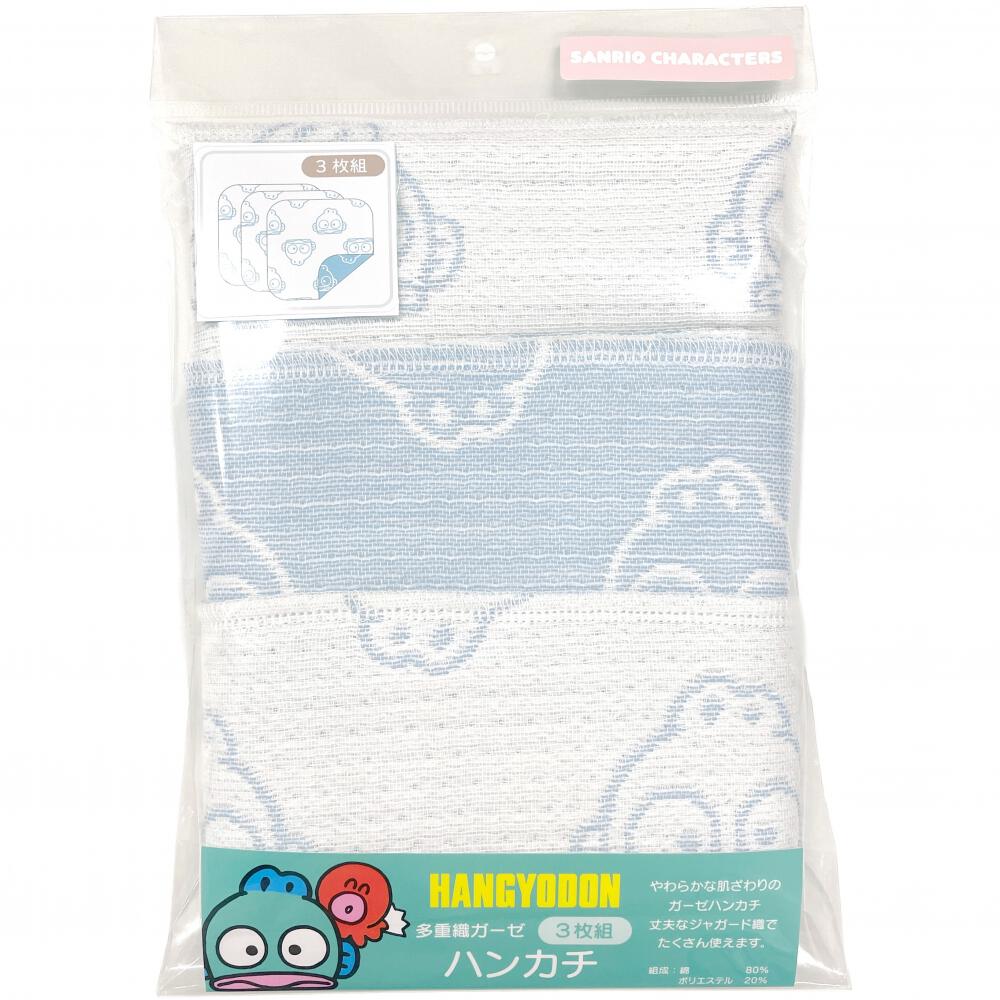 サンリオの人気キャラクター「キティ」「ハンギョドン」「ポムポムプリン」の多重織ガーゼハンカチ3枚組です。
