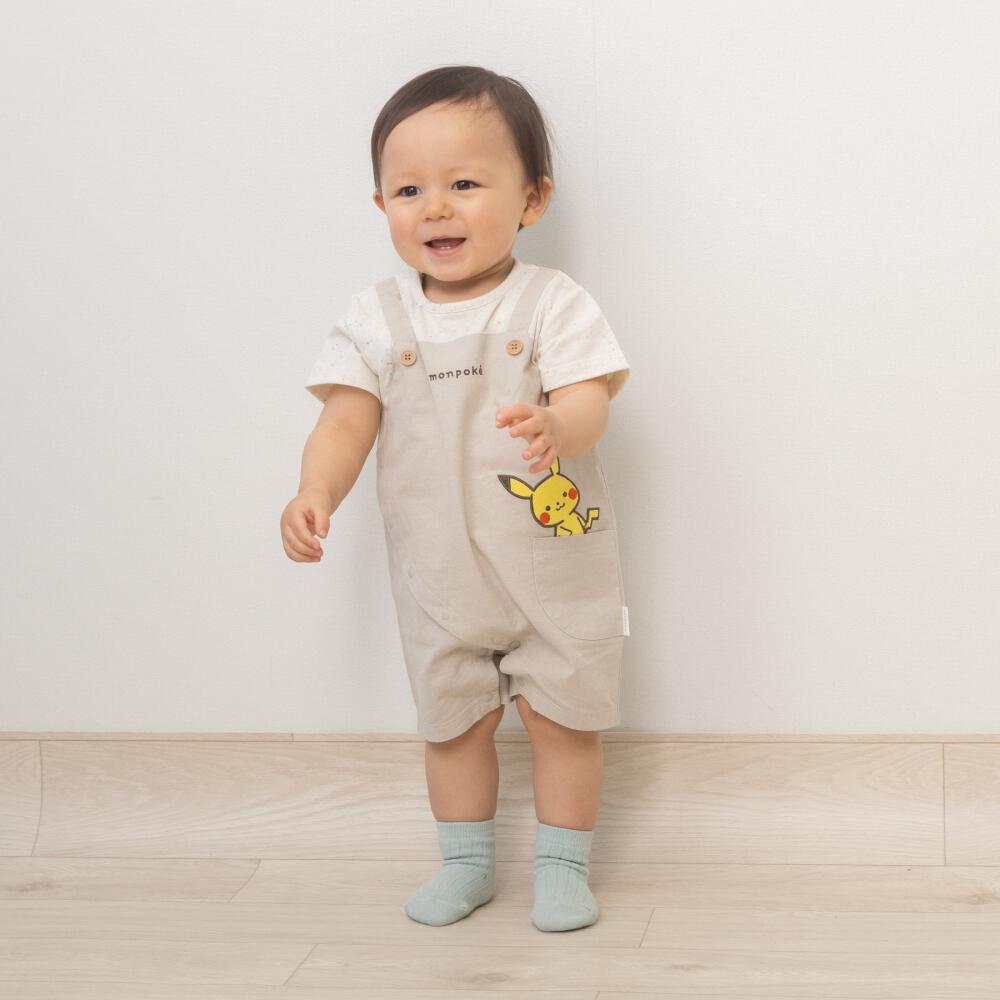 サロペット風の半袖ロンパース。涼しげなシャンブレー生地を使用しています。