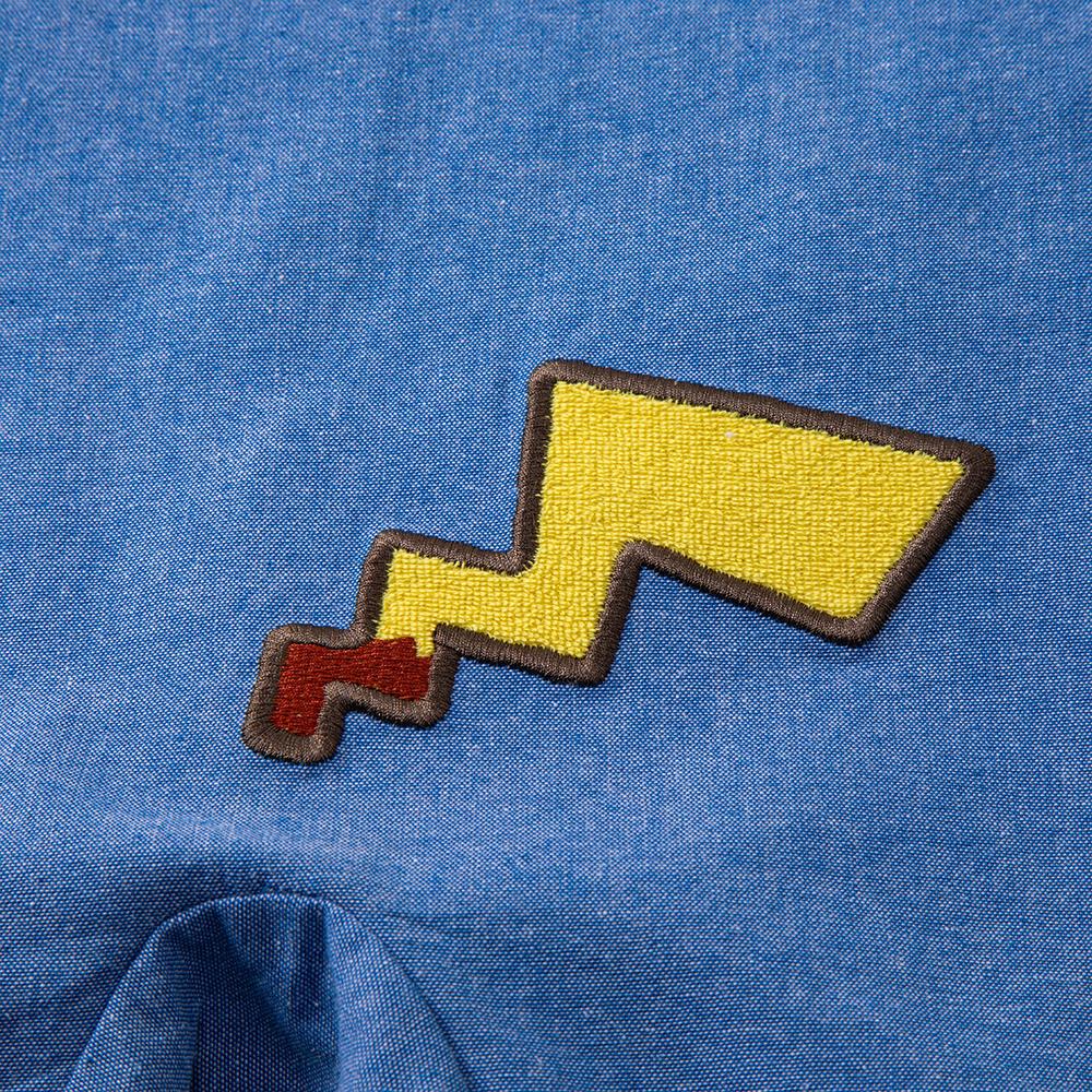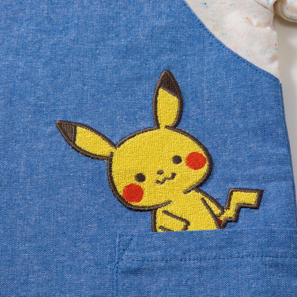 ポケットからのぞくピカチュウのアップリケ刺繍がアクセント。後身頃にはしっぽのアップリケ刺繍も入っています。