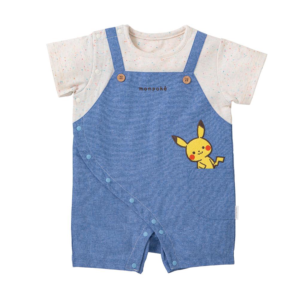 サロペット風の半袖ロンパース。涼しげなシャンブレー生地を使用しています。