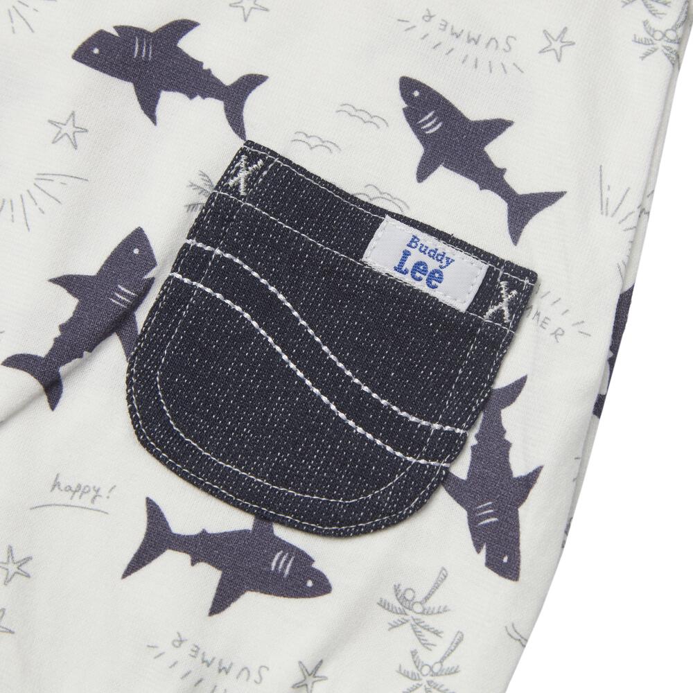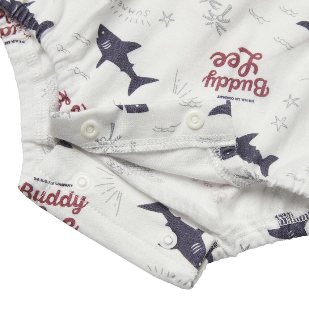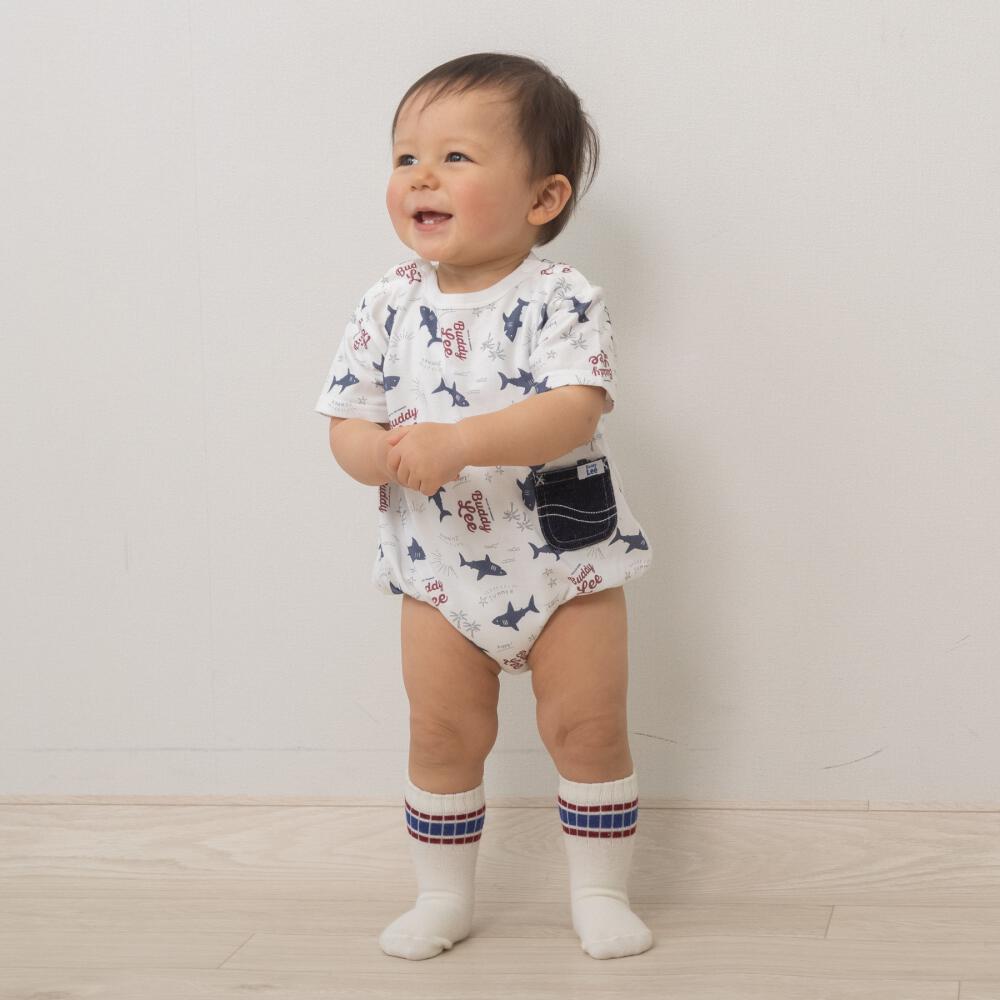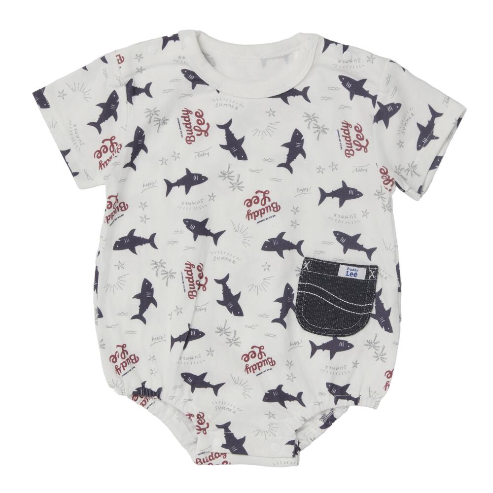 かっこいい牛柄生地サメ総柄生地にロゴのチケットがおしゃれなボディスーツです。