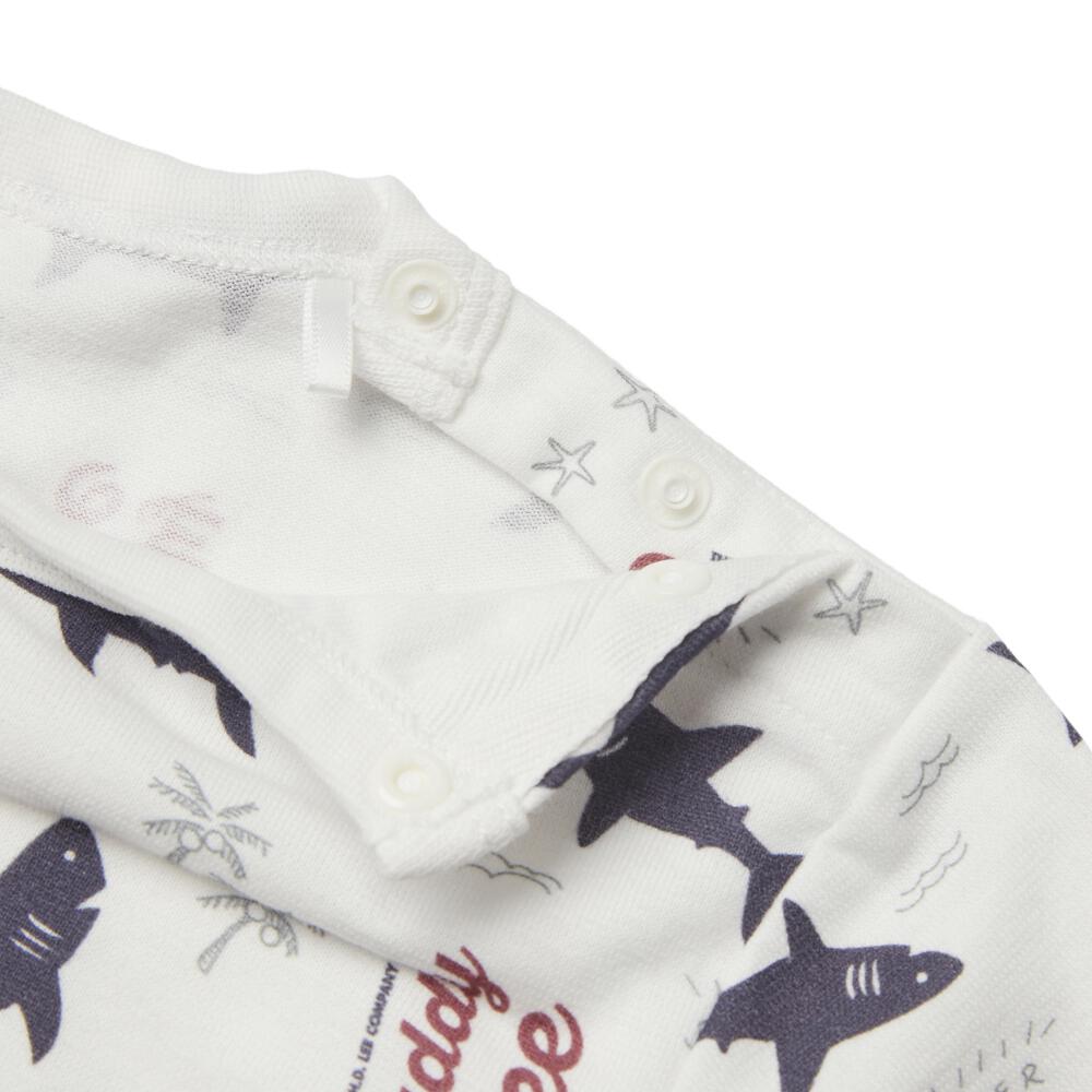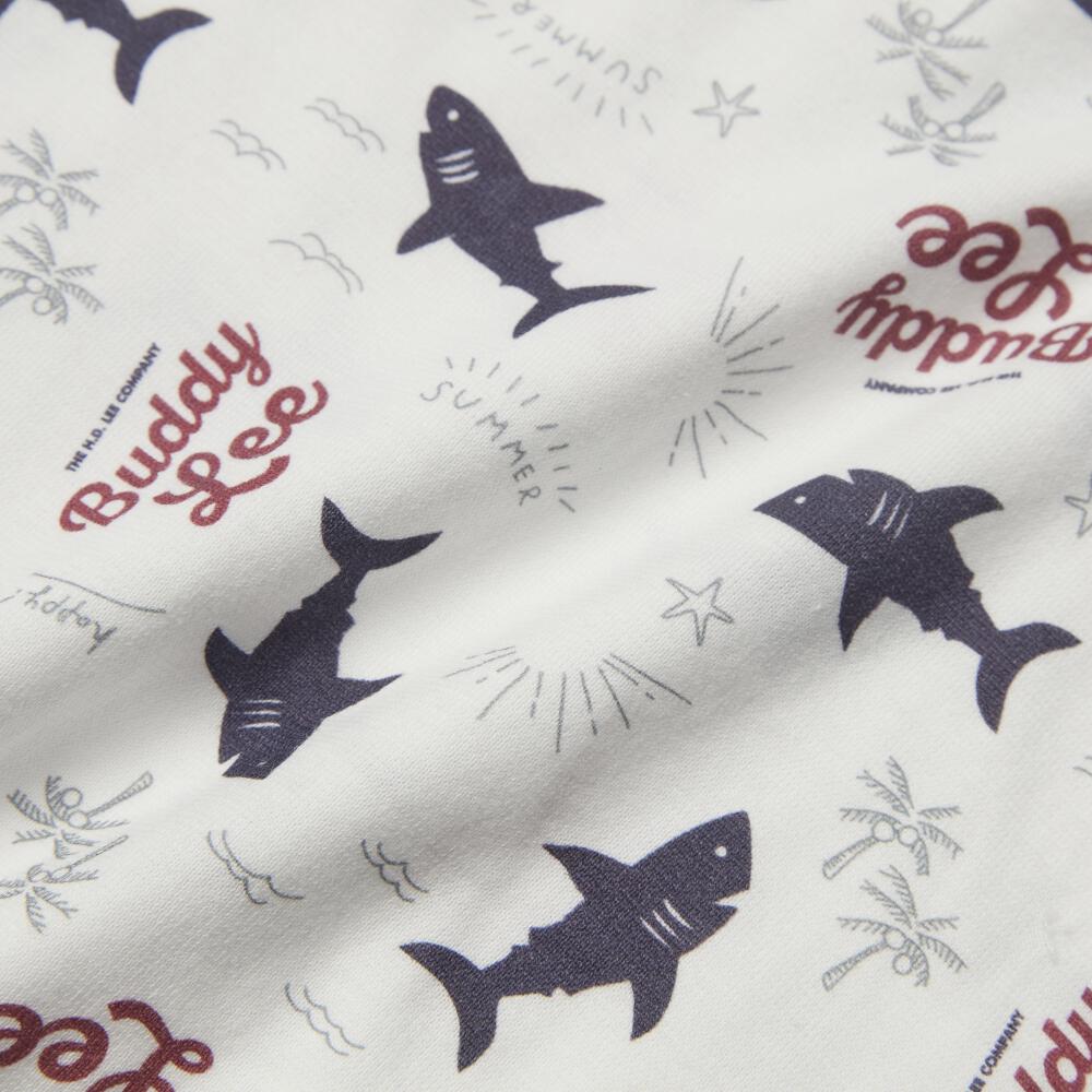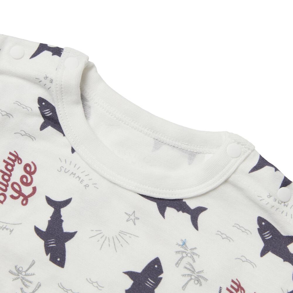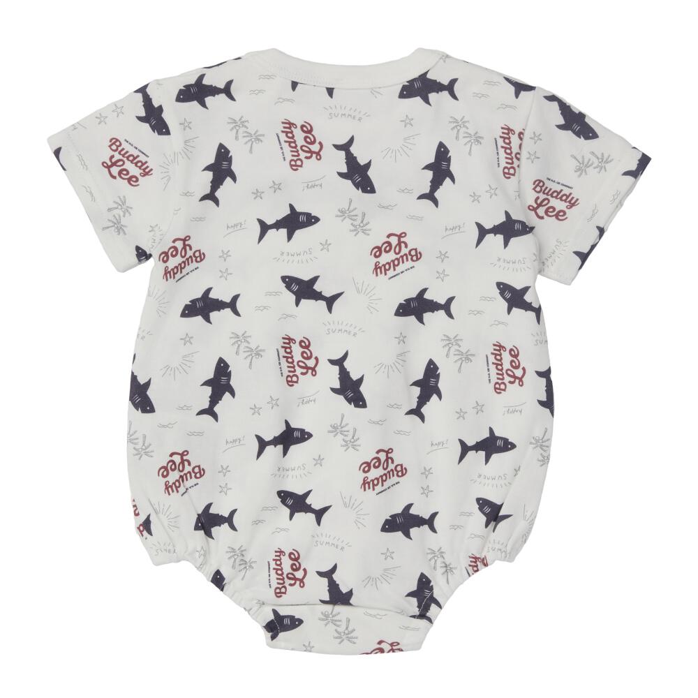かっこいい牛柄生地サメ総柄生地にロゴのチケットがおしゃれなボディスーツです。