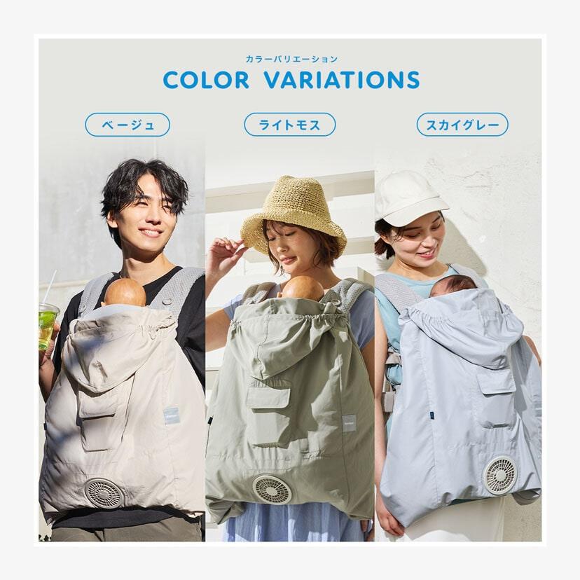 ベビーケープに付いた小型ファンで、ケープの中に外気を取り入れ、体の表面に大量の風を流すことにより、汗を気化させます。