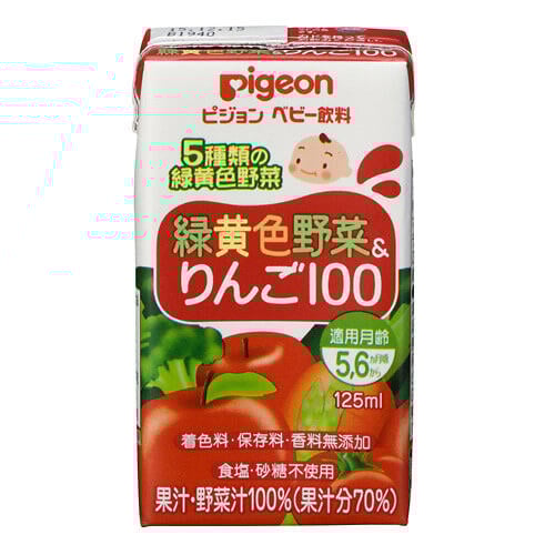 5種類の緑黄色野菜(トマト・にんじん・アスパラガス・ほうれん草・ブロッコリー)を使用。りんご果汁とブレンドして、赤ちゃんに飲みやすい飲料にしました。果汁+野菜汁100%(果汁70%)。