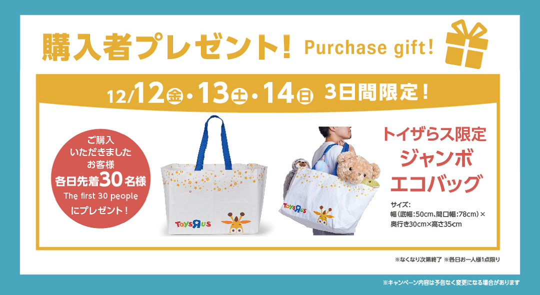 12月12日(金)~12月14日(日)の3日間、トイザらスオリジナルのノベルティグッズのプレゼントをご用意いたします。